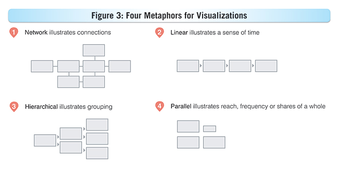 3. Show the data and show comparisons. Picking the best type of visualization is an art and science; however, the basic rule of thumb is to choose a spatial metaphor that will show your data and the relationships within it, with minimum distractions or effort on the part of the viewer. As Eddie Breidenbach explains, most graphic arrangements fall into one of four categories or metaphors (see Figure 3):