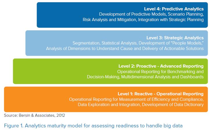 The first step in a big data journey is to understand the maturity of your organization from an analytics perspective. The business intelligence (BI) infrastructure and processes you have in place will influence how rapidly your business and IT teams can marshal the resources needed to capitalize on the big data opportunity. The research and advisory firm Bersin & Associates offers a good analytics maturity model to benchmark big data readiness (see Figure 1).